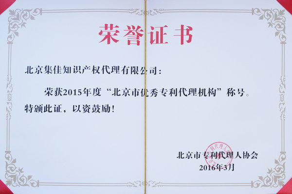 集佳獲評“2015年度北京市優(yōu)秀專利代理機構(gòu)”