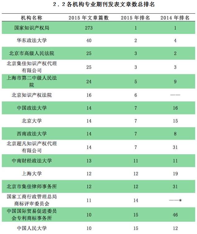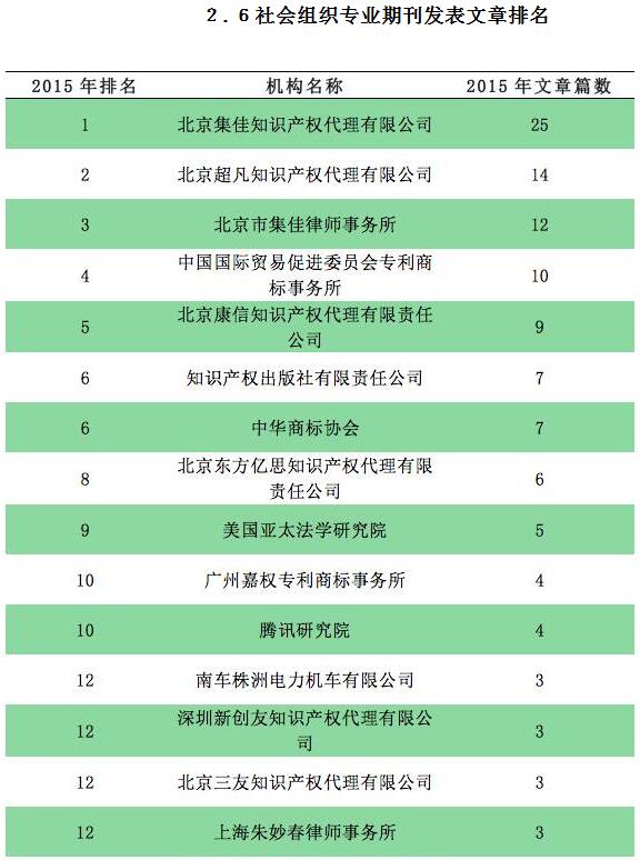 日前,上海知識產(chǎn)權(quán)研究所對2015年度我國知識產(chǎn)權(quán)專業(yè)文章發(fā)表情況進(jìn)行了統(tǒng)計(jì)分析,在包括科研院所、司法系統(tǒng)、政府部門、社會組織等各機(jī)構(gòu)文章發(fā)表總量排名中,集佳緊隨國家知識產(chǎn)權(quán)局、華東政法大學(xué)、北京市高級人民法院,以全年發(fā)表量25篇的成績,領(lǐng)跑社會組織類機(jī)構(gòu)。此外,北京市集佳律師事務(wù)所以全年發(fā)表12篇的成績在社會組織類機(jī)構(gòu)排名中名列第三。