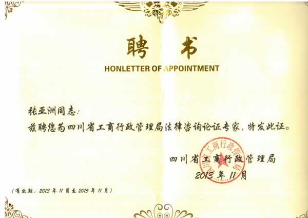 近日,經(jīng)四川省工商局綜合評議,北京市集佳律師律師事務(wù)所張亞洲律師被聘為四川省工商局行政決策法律咨詢論證專家組成員。此次一同受聘的,還包括四川省人大、省政府法制辦、省法院、省公安廳等共11家單位的有關(guān)專家學者,集佳律師事務(wù)所成為本次受聘唯一的律師事務(wù)所。