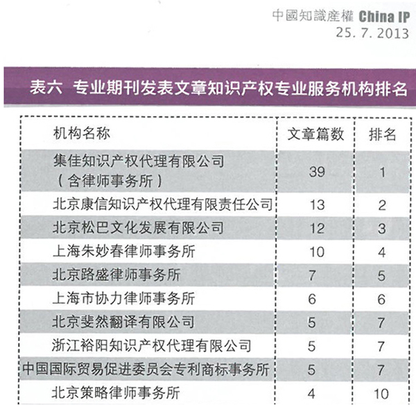 近日,《中國(guó)知識(shí)產(chǎn)權(quán)》雜志聯(lián)合上海知識(shí)產(chǎn)權(quán)研究所,發(fā)布了《2012年度我國(guó)知識(shí)產(chǎn)權(quán)專(zhuān)業(yè)文章統(tǒng)計(jì)報(bào)告》,在該報(bào)告中,集佳以在專(zhuān)業(yè)期刊發(fā)表39篇文章的較大優(yōu)勢(shì),在“2012年度專(zhuān)業(yè)期刊發(fā)表文章知識(shí)產(chǎn)權(quán)專(zhuān)業(yè)服務(wù)機(jī)構(gòu)排名”中榮登榜首。