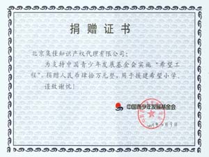 作為目前中國(guó)最大的知識(shí)產(chǎn)權(quán)服務(wù)機(jī)構(gòu)之一,集佳知識(shí)產(chǎn)權(quán)代理有限公司在自身穩(wěn)健發(fā)展的同時(shí),積極承擔(dān)著企業(yè)的社會(huì)責(zé)任。自2004年起,集佳與中國(guó)青少年發(fā)展基金會(huì)合作,積極參與“希望工程”捐建希望小學(xué)活動(dòng)。截至2009年10月,集佳已捐款一百五十余萬元,援建了彪池村集佳希望小學(xué)、陸廟村集佳希望小學(xué)、韓營(yíng)村集佳希望小學(xué)、清風(fēng)嶺集佳希望小學(xué)和清泉集佳希望小學(xué),圓了近萬名學(xué)齡兒童的求學(xué)夢(mèng)想。集佳正在用行動(dòng)兌現(xiàn)最初的承諾:“每年建一所集佳希望小學(xué)!”
