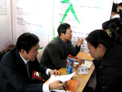 集佳特色鮮明的招聘展臺 集佳招聘人員與求職者親切交流