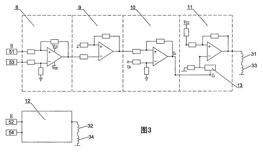 而涉案專利說(shuō)明書(shū)給出了唯一的“具體實(shí)施方式”,即:懸浮體水平運(yùn)動(dòng)控制裝置包括:①帶鐵芯的四個(gè)線圈31、32、33、34;②四個(gè)霍爾元件傳感器(磁性傳感器)51、52、53、54,分成兩組分別控制兩組線圈,進(jìn)而控制懸浮體X、Y方向的自由移動(dòng);③在底座內(nèi)還設(shè)置有控制電路板6,由完全相同的相對(duì)獨(dú)立的控制電路12組成;④控制電路12也僅僅給出一個(gè)具體實(shí)施方式,即傳感器電壓接入減法電路8(檢測(cè)電壓值),經(jīng)放大電路9(信號(hào)放大),與減法電路10的基準(zhǔn)電壓U0進(jìn)行比較,輸出到功放電路;當(dāng)輸出電壓不為0時(shí),進(jìn)行勵(lì)磁電流的調(diào)整。如下圖:
