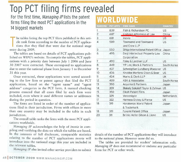根據(jù)全球權(quán)威知識(shí)產(chǎn)權(quán)刊物Managing Intellectual Property (MIP)2009年10月期公布的一份數(shù)據(jù)顯示,全球PCT申請(qǐng)統(tǒng)計(jì)中,在申請(qǐng)日(優(yōu)先權(quán)日)介于2006年7月1日至2007年6月30日之間,30個(gè)月的絕限落在2009年1月至2009年12月間的已經(jīng)公開(kāi)的PCT申請(qǐng)中,集佳知識(shí)產(chǎn)權(quán)代理有限公司以687件申請(qǐng)?jiān)谌虼頇C(jī)構(gòu)排名中僅次于一家美國(guó)事務(wù)所而位列第二,也是中國(guó)唯一一家躋身全球前五名的知識(shí)產(chǎn)權(quán)服務(wù)機(jī)構(gòu)。