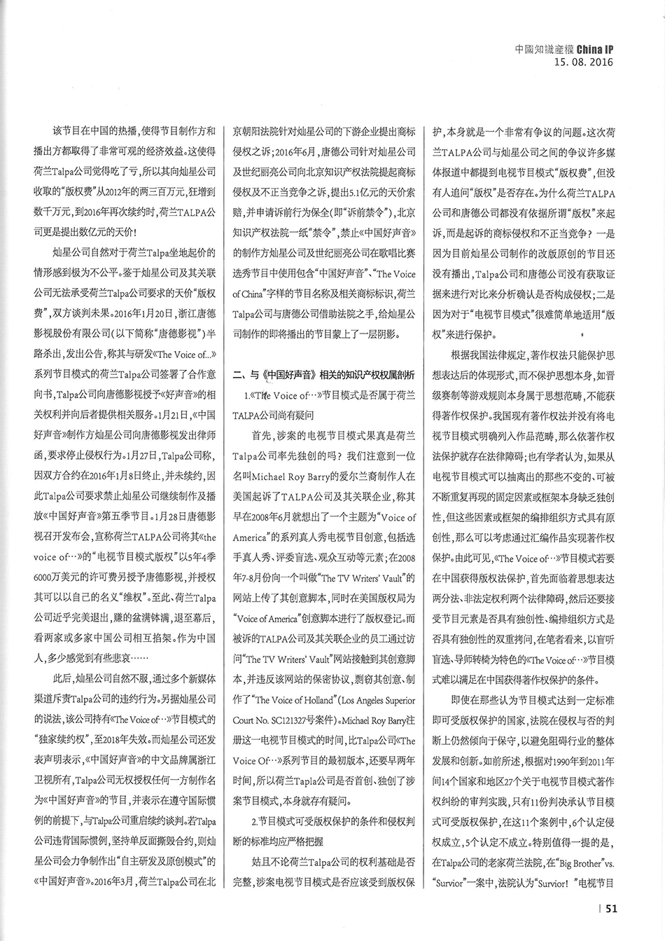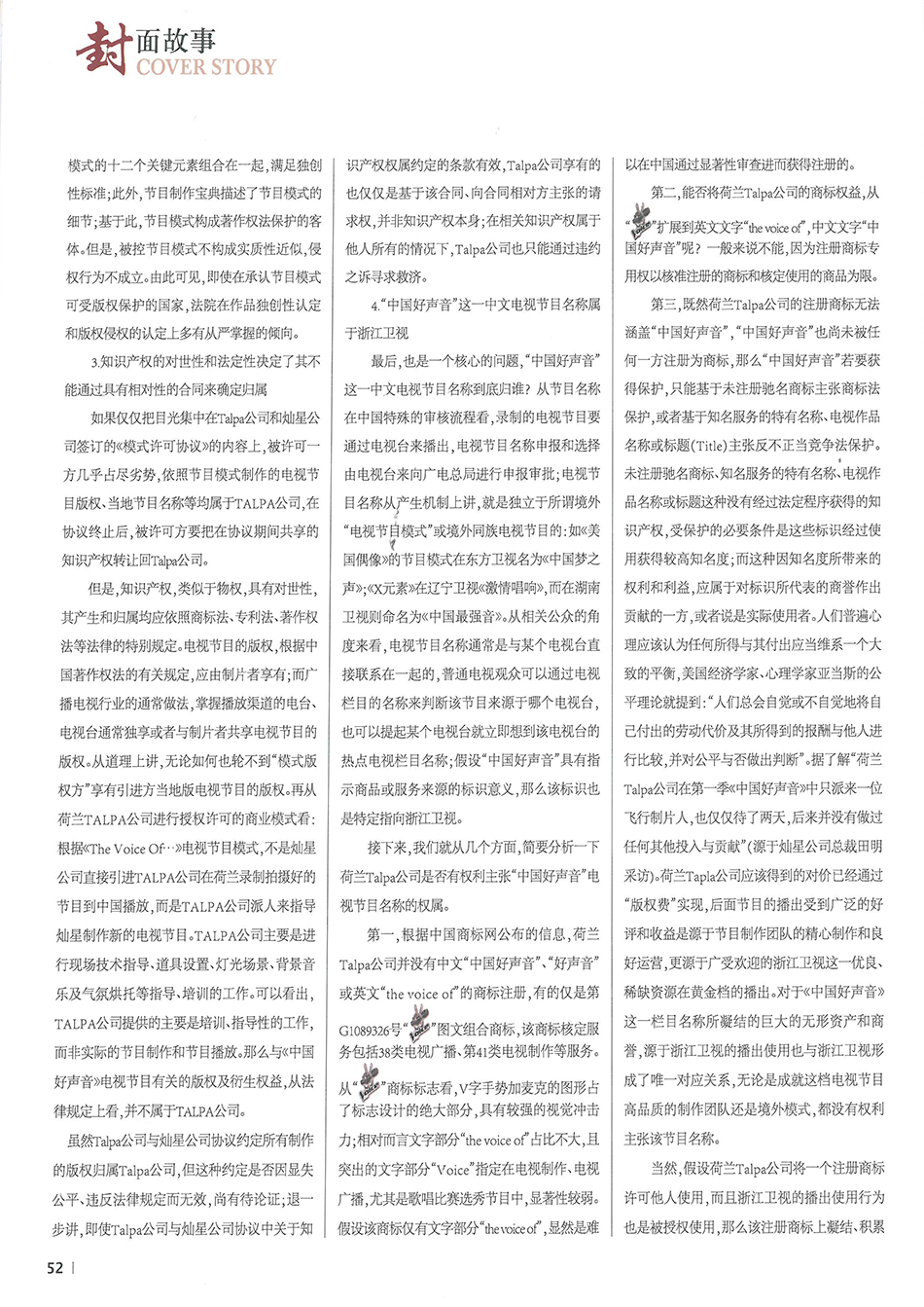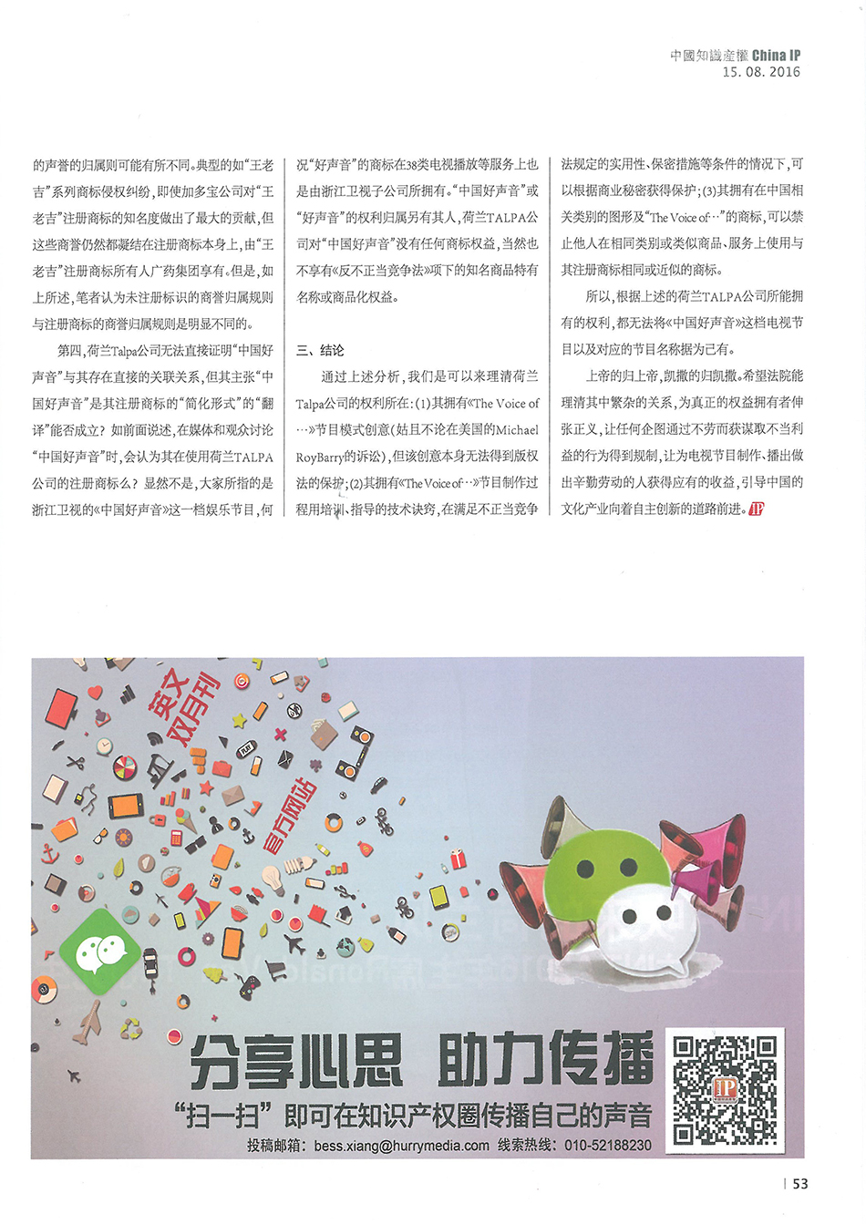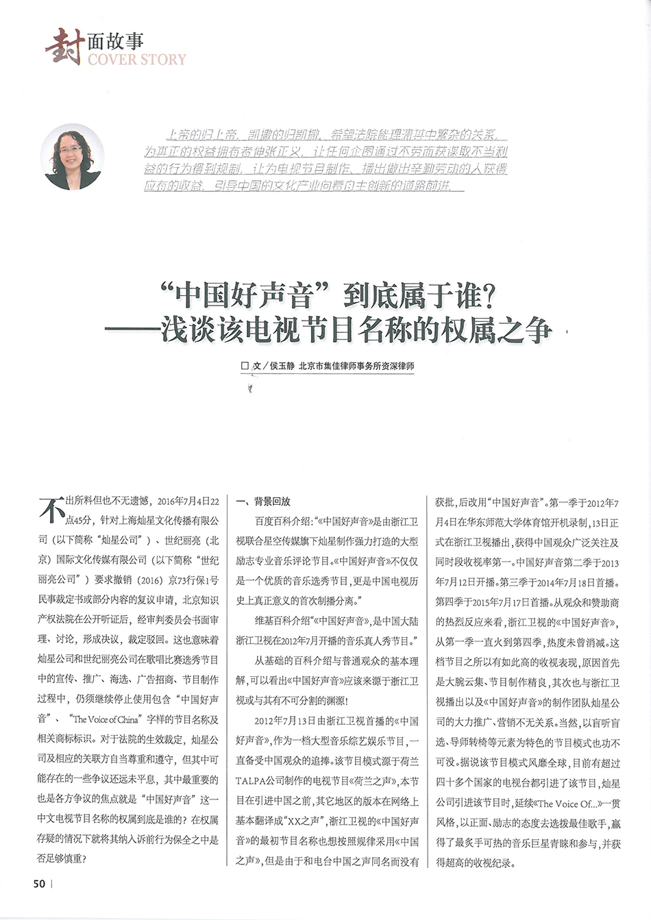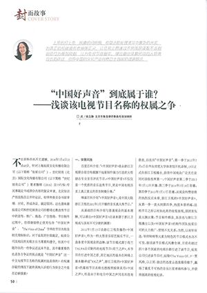 集佳資深律師侯玉靜文章《“中國好聲音”到底屬于誰?——淺談該電視節(jié)目名稱的權(quán)屬之爭(zhēng)》在《中國知識(shí)產(chǎn)權(quán)》發(fā)表