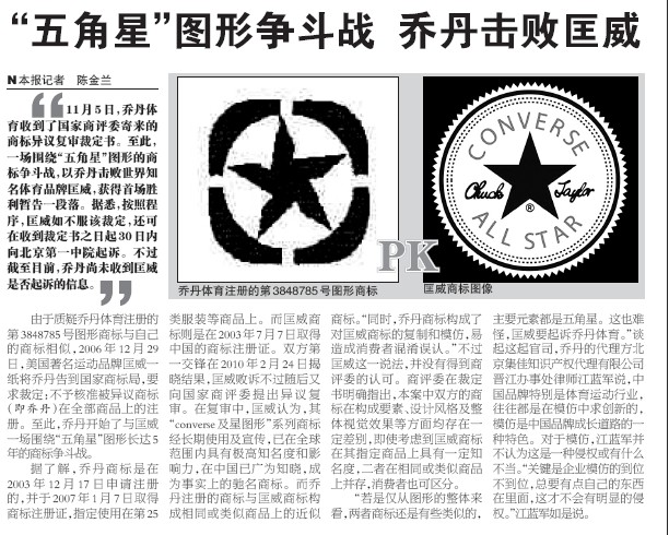 《海峽都市報(bào)》:“五角星”圖形爭(zhēng)斗戰(zhàn) 喬丹擊敗匡威