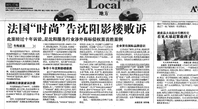 《時代商報》:法國“時尚”告沈陽影樓敗訴