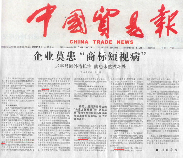 《中國(guó)貿(mào)易報(bào)》采訪:《企業(yè)莫患“商標(biāo)短視病” 老字號(hào)海外遭搶注 防患未然沒(méi)壞處》