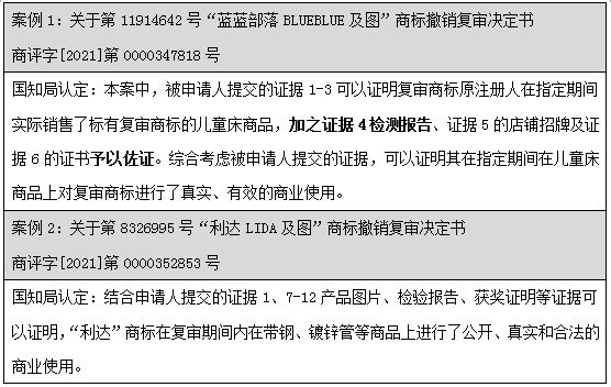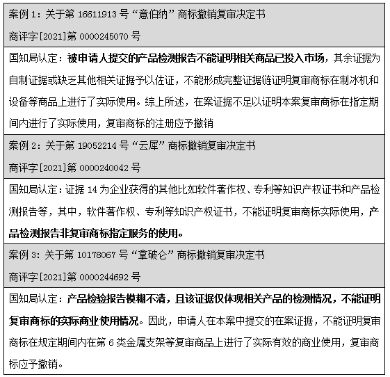 通過上述案例可見,不論是國知局還是法院階段,均有大量的裁定及判決直接認(rèn)定:產(chǎn)品檢測報告僅為產(chǎn)品檢測情況,無法證明商品進(jìn)入市場流通流域,不應(yīng)認(rèn)定為商標(biāo)法意義上的使用證據(jù)。但是針對該問題并沒有統(tǒng)一的裁判標(biāo)準(zhǔn),司法實踐中,也不乏案件綜合考量了產(chǎn)品檢測報告。部分案例列舉如下:
