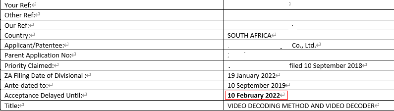 分案申請(qǐng)的授權(quán)決定期限是自PCT申請(qǐng)的提交日2019年9月10日起算的。根據(jù)南非專利法第40條的規(guī)定,授權(quán)絕限是自提交日起18個(gè)月。繳納費(fèi)用后,可以延遲授權(quán)至最長不超過3個(gè)月。向?qū)彶閱T說明理由(good cause)并繳納費(fèi)用后,審查員會(huì)給予專利申請(qǐng)進(jìn)一步延期(可以看出,該案在上述基礎(chǔ)上另外要求了8個(gè)月延遲授權(quán))。