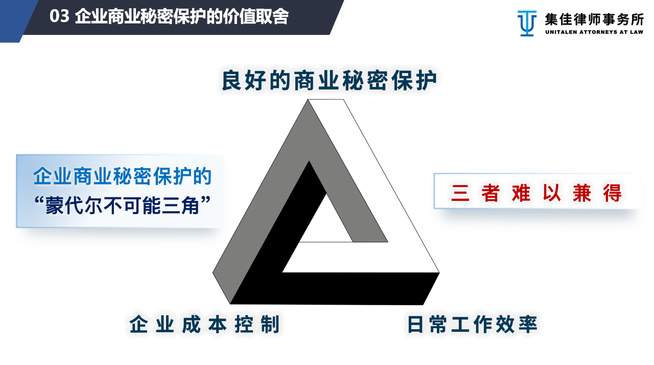 蒙代爾不可能三角又稱三元悖論,通常應(yīng)用于宏觀經(jīng)濟學,其本質(zhì)是指基于特定的情形下,三種不同位面的價值難以同時實現(xiàn),最多只能同時滿足兩個目標,而放棄另外一個目標。【19】在企業(yè)商業(yè)秘密保護中,同樣會面臨著三元悖論的局面,即“良好的商業(yè)秘密保護”,“企業(yè)成本控制”及“日常工作效率”三者之間難以兼得。例如,在基于優(yōu)先保護企業(yè)商業(yè)秘密,同時兼顧企業(yè)成本的基礎(chǔ)之下所采取的保密措施,對企業(yè)日常運營的工作效率必然會有一定程度的影響。企業(yè)所采取常見的措施包括限制個人電腦的使用、禁用通訊軟件及設(shè)備的使用、涉密材料的接觸及借閱等需多級審批、員工離職調(diào)崗的脫密流程等。而為實現(xiàn)相同等級商密保護的基礎(chǔ)之下,降低運營行政成本提升工作效率,則勢必需要應(yīng)用技術(shù)監(jiān)管手段及管理體系,比如信息安全設(shè)備及配套軟件,防數(shù)據(jù)泄漏軟件,區(qū)域監(jiān)控設(shè)備等,這無疑亦會增加企業(yè)運營成本。