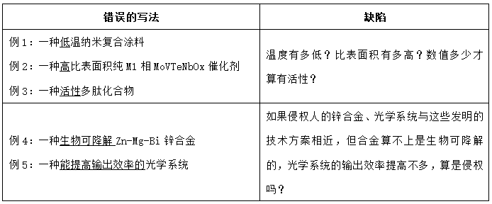 下表的示例使用了相對關(guān)系的詞語或該發(fā)明的技術(shù)效果來修飾權(quán)利要求的主題。這些修飾語讓主題讀起來更生動,突出了產(chǎn)品在技術(shù)效果方面的優(yōu)點,作為論文的題目或技術(shù)宣傳不錯,但是,基于下表中所述的“缺陷”,這些用語在權(quán)利要求中是多余的,可能導致權(quán)利要求的范圍不清楚甚至縮小,甚至給侵權(quán)者提供了有機可乘的漏洞。