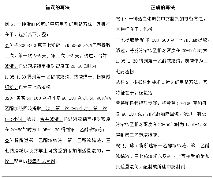 此外,撰寫人應知悉,獨權(quán)的技術(shù)特征數(shù)量越多,保護對象的范圍越小。例如,“一種桌子,其特征在于,具有4條腿。”,該權(quán)利要求告訴公眾4條腿的是本發(fā)明的桌子,1~3條腿或5條腿以上的都不是本發(fā)明的桌子;如果寫成“一種桌子,其特征在于,具有4條腿且具有圓形桌面。”,則進一步限定了4條腿且圓形桌面的才是本發(fā)明的桌子,將桌面是方形等非圓形形狀的排除到了本發(fā)明的范圍之外。所以,要精剪獨權(quán)的技術(shù)特征以構(gòu)建更寬的保護范圍,細節(jié)特征可寫入從權(quán)以構(gòu)建中范圍至窄范圍的退守性權(quán)利要求。例如,對發(fā)明點是將三七藥渣粉作為藥物活性組分的例6的發(fā)明而言,可爭取的最大保護范圍是僅將步驟1寫入獨權(quán)1,其他步驟寫入從權(quán)。