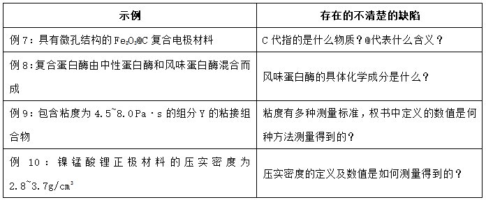 下表示例包含的符號、數(shù)值、商品名,在說明書中沒有解釋說明或具體示例時均有可能被審查員質(zhì)疑權(quán)利要求不清楚。