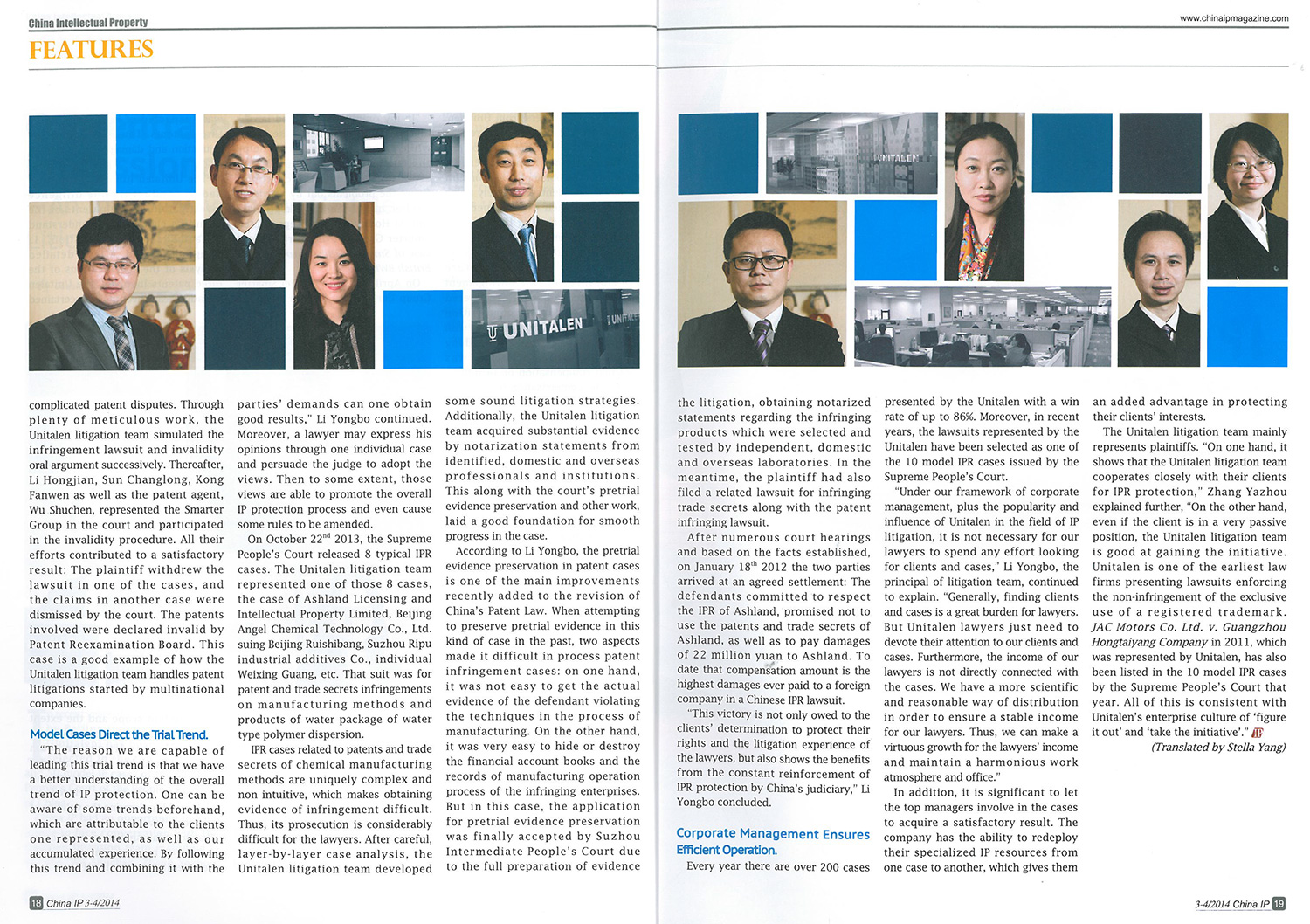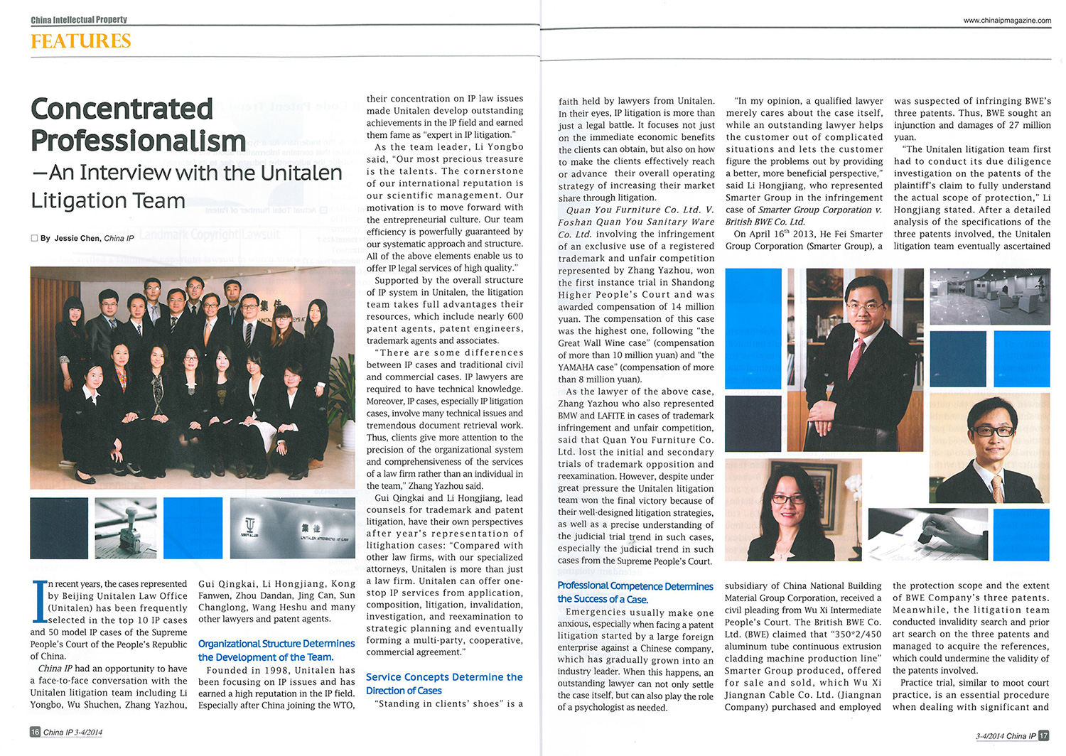 While litigation cases represented by Unitalen have been continuously enlisted in Top 10 IP Cases and/or 50 Model IP Cases by the Supreme People’s Court in past few years, Unitalen’s litigation team behind these glorious successes attracts more and more attention and recognition. Recently China Intellectual Property released its interview with Unitalen litigation department (Issue 60 for March-April 2014) featuring the team’s concentrated professionalism in IP litigations.