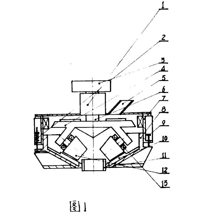 上述對(duì)比文件(雷蒙機(jī))的附圖中,其磨輥和磨盤(pán)兩者磨面的外輪廓線與地面垂直,且二者的軸心線平行。因此,磨輥與磨盤(pán)的相對(duì)位置關(guān)系僅為簡(jiǎn)單的內(nèi)外關(guān)系(完全內(nèi)側(cè)),也即是二者磨面的外輪廓線與軸心線均與地面垂直,并不存在上下關(guān)系。然而,在本專利的主要實(shí)施例中,磨輥與磨盤(pán)之間存在著上下關(guān)系,呈斜上方布置,參見(jiàn)下述該專利的附圖1: