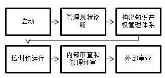 目前貫標輔導咨詢,市場份額占比較大的有兩種模式:一種是基于咨詢機構(gòu)提供的一套符合國家標準的模板,企業(yè)根據(jù)知識產(chǎn)權(quán)的自身運作形成記錄文件后爭取第三方認可;另一種,是在咨詢機構(gòu)的全程輔導下,完成啟動、管理現(xiàn)狀診斷、構(gòu)建知識產(chǎn)權(quán)管理體系、培訓和運行、內(nèi)部審查和管理評審、外部審查6個模塊(見圖1),系統(tǒng)的構(gòu)建知識產(chǎn)權(quán)管理體系。