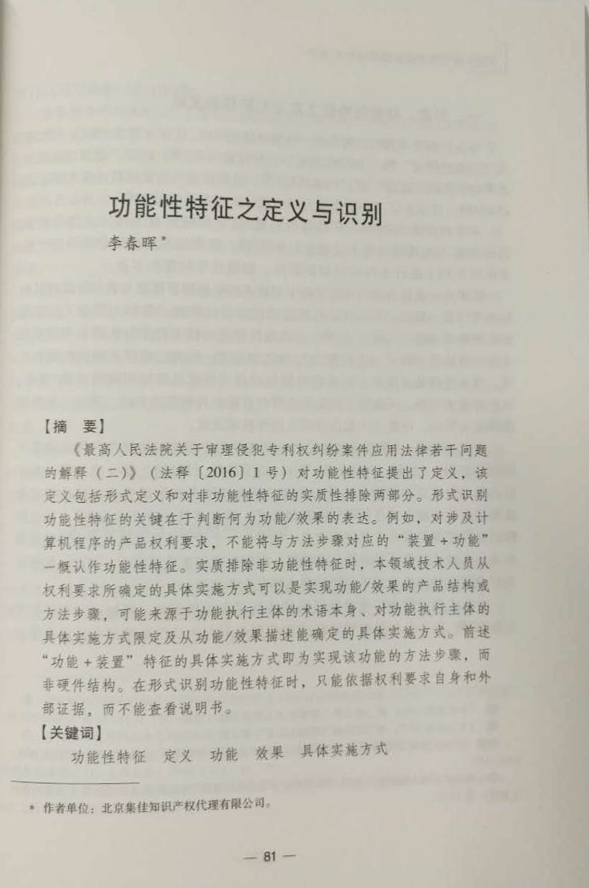 為了進(jìn)一步提升全國專利工作者對中國專利法及其實(shí)施細(xì)則的理解和適用水平,中華全國專利代理人協(xié)會(huì)舉辦了本次征文活動(dòng),就“專利授權(quán)和確權(quán)程序中文件的修改”、“功能性特征限定對權(quán)利要求保護(hù)范圍的影響”等主題,向廣大審查員、專利代理人以及社會(huì)各界知識產(chǎn)權(quán)工作者征集論文。活動(dòng)吸引了國家知識產(chǎn)權(quán)局專利局、廣大專利代理機(jī)構(gòu)、法院、企業(yè)、以及大專院校知識產(chǎn)權(quán)工作者們的熱情參與,共收到稿件百余篇。經(jīng)過評審委員會(huì)的匿名評審,評選出20余篇優(yōu)秀論文,集佳合伙人李春暉以扎實(shí)的理論基礎(chǔ),結(jié)合多年來豐富的專利代理經(jīng)驗(yàn)撰寫的《功能性特征之定義與識別》入選優(yōu)秀。