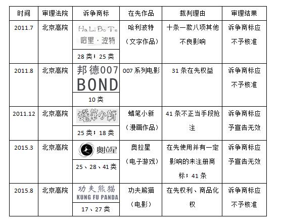 對于這種權利沖突類型,最初因缺少明確的法律規(guī)制,對在先作品名稱不予保護的情況并不少見;但隨著遏制惡意搶注的加強,商標禁注的“絕對條款”開始被適用,比如援引“其他不良影響”條款不予注冊的“哈里波特”,再比如援引“不正當手段搶注”條款不予注冊的“蠟筆小新”。但用“絕對條款”保護相對權利畢竟有些名不正言不順,北京高院藉由“邦德007”、“功夫熊貓”兩案,首次將在先影視作品名稱、角色名稱作為在先權益進行保護,引導適用“相對條款”而不是“絕對條款”來解決這種沖突。在此期間,也有類似“奧拉星”的案件,適用“在先使用并有一定影響的未注冊商標”條款來保護在先游戲名稱。本文附表一總結了近年來北京法院在商標授權確權類案件中保護在先各類作品名稱的情況,供讀者參考。