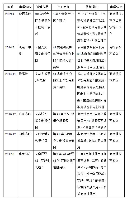 在已決案例中,一部作品的名稱——作品的類型無論是影視節(jié)目還是游戲——如果和在先注冊的商標重合了,很少認定商標侵權成立的,理由大概有三種:第一,作品名稱并非商標性使用,比如被訴侵權的《功夫熊貓》電影、《如果愛》電視欄目、《全民逆戰(zhàn)——穿越生死線》游戲;第二,作品與在先注冊商標核定的商品或服務不類似,比如被訴侵權的《星光大道》電視欄目、《非誠勿擾》電視欄目;第三,在先注冊商標標識,相對于作品的內容、主題等特點來說具有直接的描述性,不能禁止他人正當使用,比如被訴侵權的《挖坑》、《保皇》游戲。商品類似問題和正當使用問題,涉及到商標標識及作品的諸多具體細節(jié),個案性很強;但商標性使用問題,幾乎是所有涉及這類沖突的案件中難以繞開的爭議焦點。本文附表二,總結了各地法院對此類案件的審理情況。