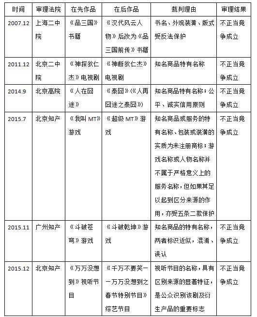 如上所述,這種沖突類型實際上是比較典型的仿冒之訴。這種沖突發(fā)生在同類作品之間,與發(fā)生在同類商品或服務之間,并沒有實質上的區(qū)別。此類案件審理的難點在于,能否把原告主張的影視名稱、游戲名稱等作品名稱作為反不正當競爭法第五條第二項下的“知名商品的特有名稱”進行保護。在武漢華旗訴光線傳媒、徐崢《泰囧》一案中,法院同時適用了反法第五條第二項和第二條公平、誠實信用原則條款,以第二條原則性條款來補強適用第五條第二項稍顯牽強的缺憾;在北京知識產權法院審理的《我叫MT》一案中,法院也注意到“游戲名稱或人物名稱并不屬于嚴格意義上的服務名稱”,但認為可以將“知名商品/服務名稱”擴大到游戲名稱、人物名稱,條件是“其足以起到區(qū)分來源的作用”。本文附表四總結了此類案件的審理情況,供讀者參考。