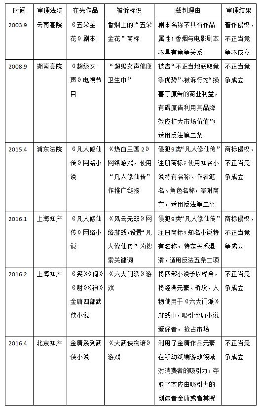 這種類型的案件目前數(shù)量不多,但可以預見,將文化轉化為商業(yè)力量已經是文化傳媒產業(yè)的大趨勢,隨之而來的類似案件將會急劇增加。從已決的案件結果看,對于在先作品名稱的商業(yè)化利用問題,司法判決已經從不保護逐漸轉向保護;在法律適用方面,較多的案例引用反不正當競爭法第二條的一般條款進行判決,也存在個案適用反不正當競爭法第五條第二項。筆者認為,將他人在先作品名稱作為自身商品或服務的標識使用,確實可能會使人誤認為該商品或服務與作品權利人之間存在授權許可、合作等特定關系,但這種認知不同于商品或服務來源的混淆,與反法仿冒意義上的混淆、誤認還是存在明顯區(qū)別。何況,反法第五條的保護范圍通常是在類似商品或服務的范圍之內,將這一條款擴大適用到作品的衍生商品或服務范圍,稍顯牽強。因此,在反法第五條修改之前,適用第二條一般性條款似乎更為適當。本文附表五總結了此類案件的審理情況,供讀者參考。