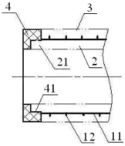 如圖1所示,基于該背景技術(shù),本申請的申請人提出了一種新型的鋼骨架塑料復(fù)合管,其權(quán)利要求1的技術(shù)方案為:一種鋼骨架塑料復(fù)合管,包括經(jīng)線(11)和緯線(12)組合而成的鋼絲網(wǎng)(1),所述鋼絲網(wǎng)(1)的內(nèi)、外兩側(cè)分別設(shè)置有內(nèi)層塑料(2)和外層塑料(3),所述外層塑料(3)的端部與所述鋼絲網(wǎng)(1)的端部平齊,其特征在于,所述內(nèi)層塑料(2)具有突出于所述鋼絲網(wǎng)(1)的端部的突出部(21)。