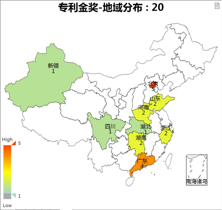 在20件金獎專利中,北京以5件領跑全國,廣東4件緊跟,北京和廣東仍然占據(jù)明顯的優(yōu)勢。值得一提的是,此次金獎評選,中西部地區(qū)入選專利量明顯上升。河南、湖北、湖南、四川、新疆都有斬獲。其中,河南2件,湖南2件(實際為3件,為國家電網和國家電網湖南公司共同申請,但是國家電網是第一申請人,地址為北京,故統(tǒng)計到北京)、四川和新疆各1件。