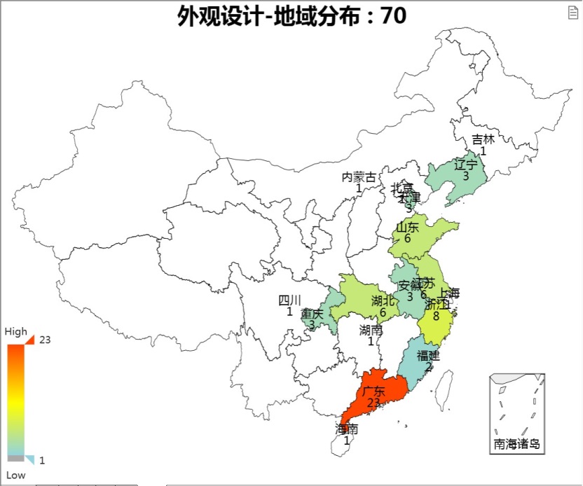 四、獲獎外觀設計集中在東部沿海地區(qū) 70件獲獎的外觀設計中,超過90%的獲獎外觀設計分布在廣東、浙江、福建、江蘇、上海、山東、北京、天津等東部沿海發(fā)達地區(qū)。這些地區(qū)的加工制造業(yè)發(fā)達,工業(yè)設計實力強勁。