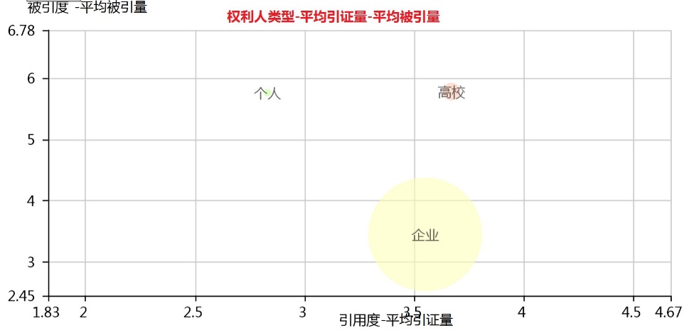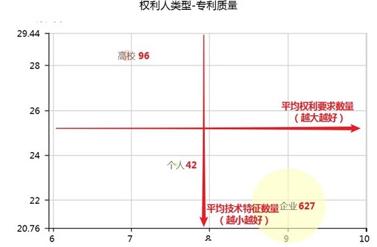 下圖為企業(yè)、高校、個人三種不同類型的權利人的專利質量氣泡。橫坐標為平均權利要求數(shù)量,縱坐標為平均技術特征數(shù)量,氣泡大小為獲獎專利數(shù)量。