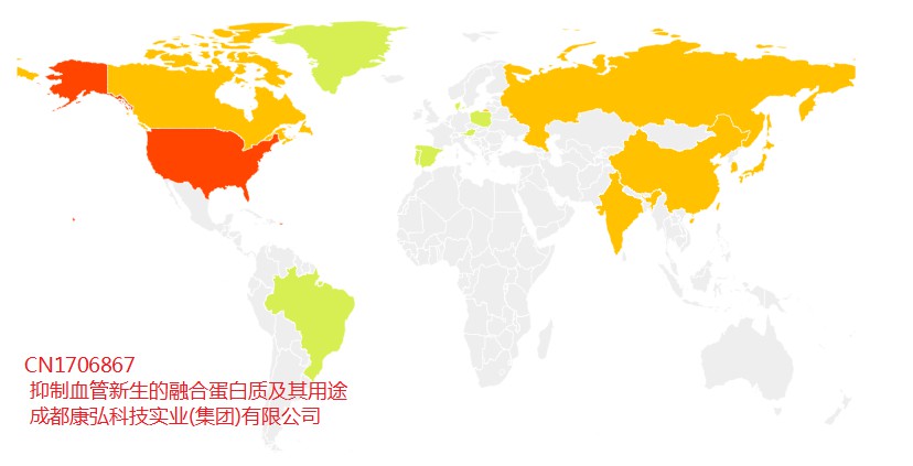 在獲獎專利中,同族數(shù)量排名第一的是成都康弘科技實業(yè)(集團)有限公司的【CN1706867-抑制血管新生的融合蛋白質及其用途】,該專利不僅經歷過無效考研,還擁有多達25個專利族,在14個國家獲得了授權。