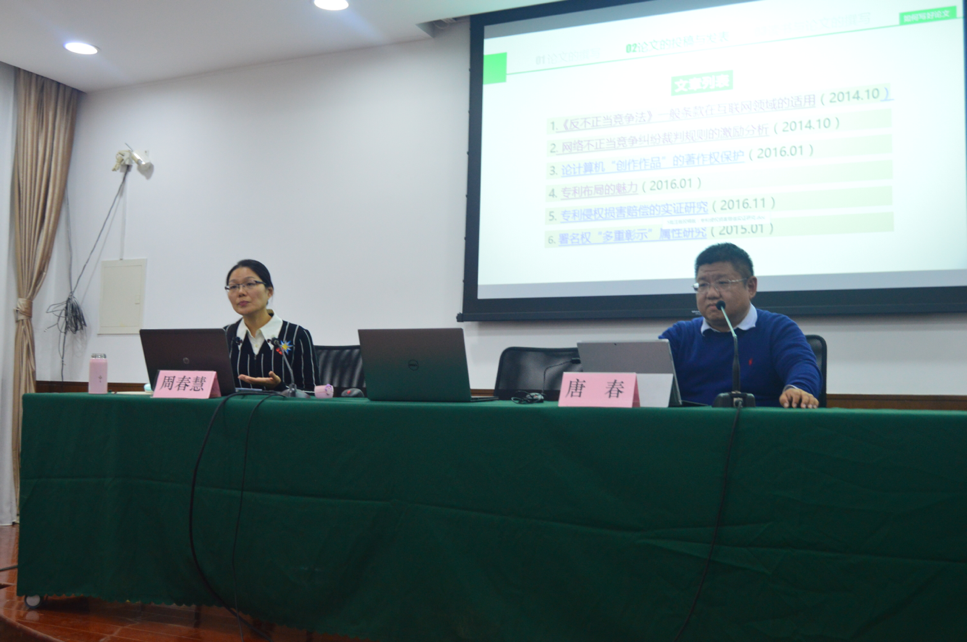 2017年11月12日上午9點半,第三屆“華政·集佳”杯綜述競賽系列學術活動之“知識產權論文寫作與投稿”專題講座在長寧校區(qū)交誼樓第三會議室進行。講座主講人為《電子知識產權》資深編輯周春慧老師,主持人為華東政法大學知識產權學院副院長唐春副教授。講座內容分為撰寫與投稿兩個部分。在論文撰寫方面,周老師就 “選題”、“文獻查閱、收集、閱讀”、“結構”、“撰寫”、“修改”、“成稿”六個方面進行了詳細的介紹,指出了在相關撰寫過程中應當避免的常見錯誤,講授了一篇好論文的具體撰寫方法。在投稿方面,周老師介紹了知識產權領域主要學術期刊的基本情況,以及各個期刊所偏好的論文題材,引導同學們有的放矢。在最后交流環(huán)節(jié),周老師對同學們的問題進行了答疑解惑,與同學們進行了進一步的交流。