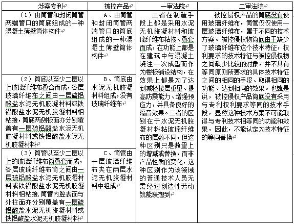 首先,權(quán)利要求明確記載筒管玻璃纖維布層數(shù)為“不少于二層”,實際上該限定本身已排除一層的實現(xiàn)方式。其次,還應(yīng)當(dāng)注意說明書對于權(quán)利要求的解釋作用對等同特征認(rèn)定的約束作用,客觀上,涉案專利說明書明確記載了“可以少到僅兩層”,并基于此強調(diào)其技術(shù)效果。 因此,在等同特征判斷時,不應(yīng)當(dāng)再將權(quán)利要求限定已經(jīng)排除的一層的實現(xiàn)方式認(rèn)定為“不少于二層”的等同特征,以有效平衡社會公眾的權(quán)益。 此外,該案二審判決體現(xiàn)了另外一個觀點:由于早于本案專利發(fā)明存在著筒底及筒管組成混凝土薄壁筒體構(gòu)件的公知技術(shù),所以,被控侵權(quán)物在筒管上使用一層玻璃纖維布更接近于公知技術(shù)。沿用與公知技術(shù)相近似的技術(shù)方案,屬于公眾的權(quán)利。盡管該觀點與等同特征的判斷無直接關(guān)聯(lián),但在該判決中進(jìn)一步依職權(quán)從現(xiàn)有技術(shù)抗辯的角度進(jìn)行了評述,無疑為事實認(rèn)定提供了另一維度的支撐。