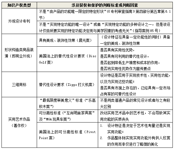 表1 不同類型知識產(chǎn)權(quán)關(guān)于“非功能性”的判斷標準或因素