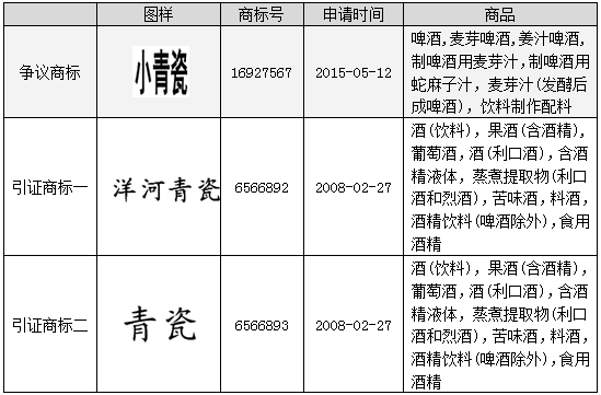 原告江蘇洋河酒廠股份有限公司(以下簡稱“洋河酒廠”)早在2008年,就在第33類“酒(飲料)”等商品上注冊了“洋河青瓷”、“青瓷”商標(biāo),并且早在其注冊之前,自1999年開始就在“白酒”商品上開始使用“青瓷”商標(biāo)。但是,在2015年,英國凱撒啤酒有限公司在第32類“啤酒”等商品上注冊了“小青瓷”商標(biāo)。因此,洋河酒廠對該商標(biāo)提出了異議,異議的理由即為訴爭商標(biāo)與引證商標(biāo)構(gòu)成類似商品上的近似商標(biāo)。
