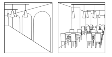 當(dāng)提交多組圖片/照片,以說明立體商標(biāo)時(shí),各圖片/照片的細(xì)節(jié)需具有對應(yīng)關(guān)系,以說明系同一保護(hù)對象。如以下示例1中,左右兩張圖片除了天花板頂部吊燈設(shè)計(jì),其他格局和桌椅擺放等,并不能表明為同一場景。因此,僅提交以下兩張圖片無法滿足店鋪裝潢的立體商標(biāo)申請要求。