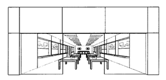 該商標(biāo)申請所提交的商標(biāo)描述為:商標(biāo)由零售商店的設(shè)計(jì)和布局組成。該商店的特征是一個(gè)透明的鑲板外墻玻璃店面,由上方的大型矩形水平面板,兩個(gè)較窄的側(cè)面面板組成。在商店內(nèi),矩形的嵌入式照明裝置橫穿商店天花板的長度。沿著側(cè)壁在凹陷的展示空間下方有懸臂式貨架,在商店中間平行于墻壁,有并成一直線的矩形桌子,從商店的正面延伸到商店的背面。沿著側(cè)壁有多層擱板,在商店的后面有一個(gè)帶凳子的長方形桌子,下方放置視頻屏幕。墻壁、地板、照明設(shè)備和其他固定裝置以虛線顯示,不屬于商標(biāo)的特征;但是,各種物品的放置被認(rèn)為是整體標(biāo)識的一部分。