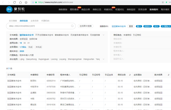 為此,筆者在摩知輪以“肽”為關鍵字檢索2020年包含“肽”的商標駁回復審決定書,檢索結果顯示,截止2020年12月3日,共計出現(xiàn)包含“肽”的商標駁回復審決定書82件,其中80件予以駁回,僅2件通過行政訴訟予以初步審定并公告。在82份駁回復審決定中,71件以《商標法》第十條第一款第(七)項“帶有欺騙性,容易使公眾對商品的質量等特點或者產(chǎn)地產(chǎn)生誤認的”條款駁回。