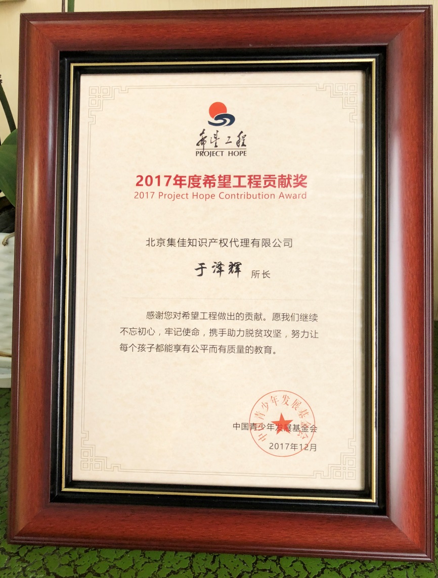 近日,集佳收到了中國(guó)青少年發(fā)展基金會(huì)頒發(fā)的“希望工程優(yōu)秀合作伙伴”獎(jiǎng)與“2017年度希望工程貢獻(xiàn)獎(jiǎng)”,特別表彰于澤輝所長(zhǎng)帶領(lǐng)集佳對(duì)希望工程作出的支持與貢獻(xiàn)。此外,青基會(huì)在《中國(guó)青年報(bào)》刊發(fā)整版感謝函,對(duì)包括集佳在內(nèi)的100多家單位和企業(yè)衷心致謝。