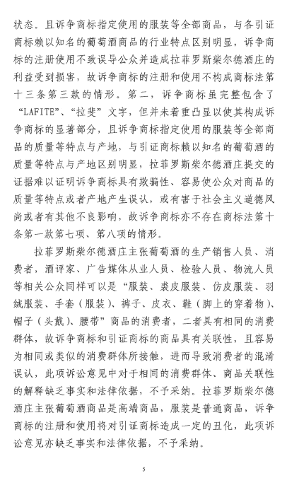 本案是一起適用“淡化”理論保護(hù)馳名商標(biāo)的典型案例。在論理部分,法院指出,訴爭(zhēng)商標(biāo)使用在服裝商品上,會(huì)使相關(guān)公眾聯(lián)想到引證商標(biāo),且會(huì)認(rèn)識(shí)到使用訴爭(zhēng)商標(biāo)的商品并非由拉菲羅斯柴爾德酒莊提供或與之存在特定關(guān)聯(lián)。也就是說(shuō),法院認(rèn)為此時(shí)混淆、誤認(rèn)的可能性并不存在。但是,這種狀況的存在依然會(huì)損害引證商標(biāo)權(quán)利人的利益,因?yàn)橐C商標(biāo)的顯著性被淡化了,引證商標(biāo)與其權(quán)利人之間的固定聯(lián)系被破壞了。
