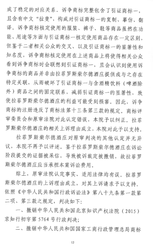 近日,北京市高級(jí)人民法院就 “卡斯特拉斐CASTEL LAFITE”商標(biāo)(由辛集市福泰皮業(yè)有限公司在2013年1與14日申請(qǐng)注冊(cè),核定商品為第25類服裝等)無(wú)效宣告一案,做出終審判決,認(rèn)定法國(guó)拉菲羅斯柴爾德酒莊在33類酒類商品上在先注冊(cè)的“LAFITE”商標(biāo),確為公眾所熟知,已構(gòu)成馳名商標(biāo);訴爭(zhēng)商標(biāo)“卡斯特拉斐CASTEL LAFITE”完整包含了在先馳名商標(biāo)“LAFITE”,且含有的中文“拉斐”是“LAFITE”常用的翻譯形式之一,因此訴爭(zhēng)商標(biāo)構(gòu)成了對(duì)引證馳名商標(biāo)的復(fù)制、模仿或翻譯,破壞了引證商標(biāo)與其標(biāo)示商品之間的固定聯(lián)系,減弱了“LAFITE”商標(biāo)的顯著性,使拉菲羅斯柴爾德酒莊的利益可能受損。據(jù)此,北京市高級(jí)人民法院判決撤銷一審判決及商評(píng)委裁定,并責(zé)令商評(píng)委重新作出裁定。