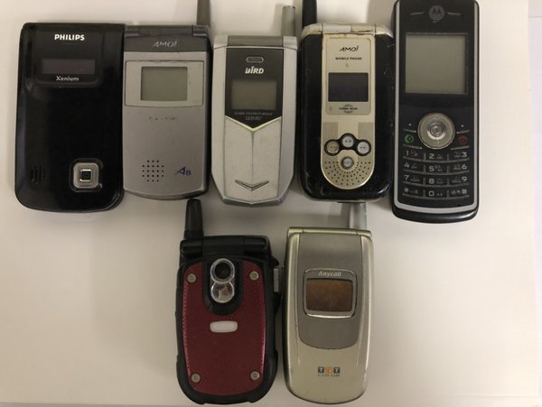 (請(qǐng)求人提交七款舊手機(jī)試圖作為使用公開(kāi)證據(jù),從左至右、從上到下依次為:飛利浦9@9r、夏新A8、波導(dǎo)V08、夏新M66、摩托羅拉W161、松下X77、三星SGH-S508)