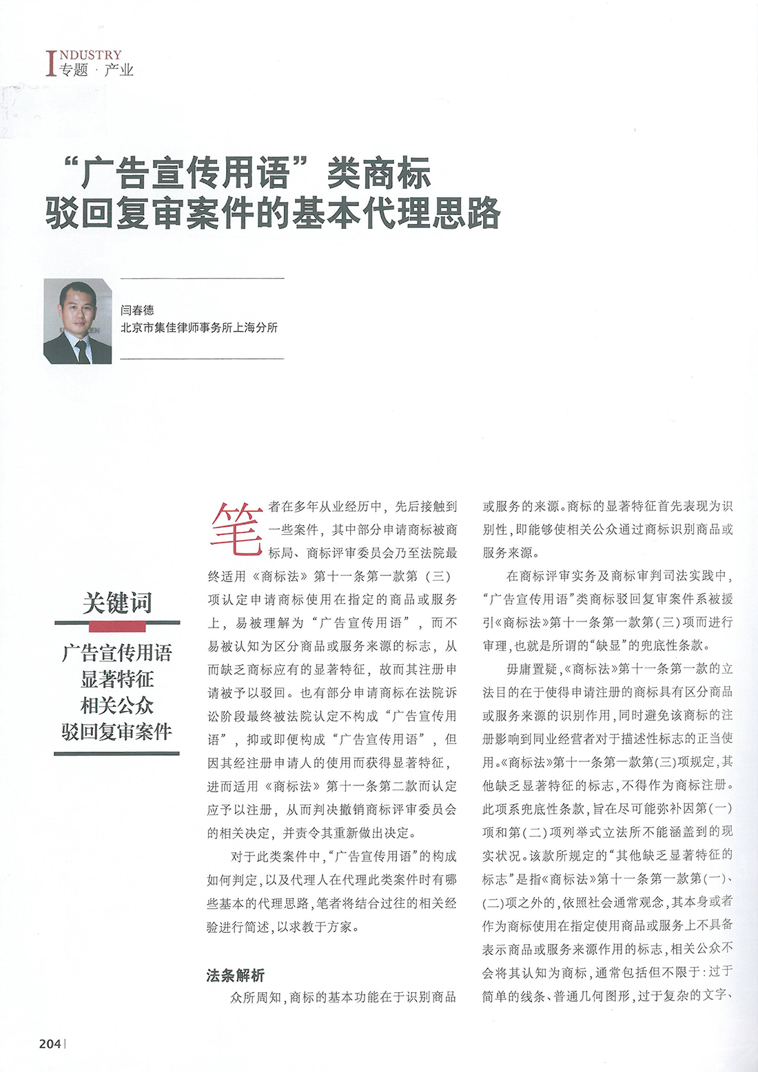 集佳文章《“廣告宣傳用語”類商標駁回復(fù)審案件的基本代理思路》在《中國知識產(chǎn)權(quán)》發(fā)表
