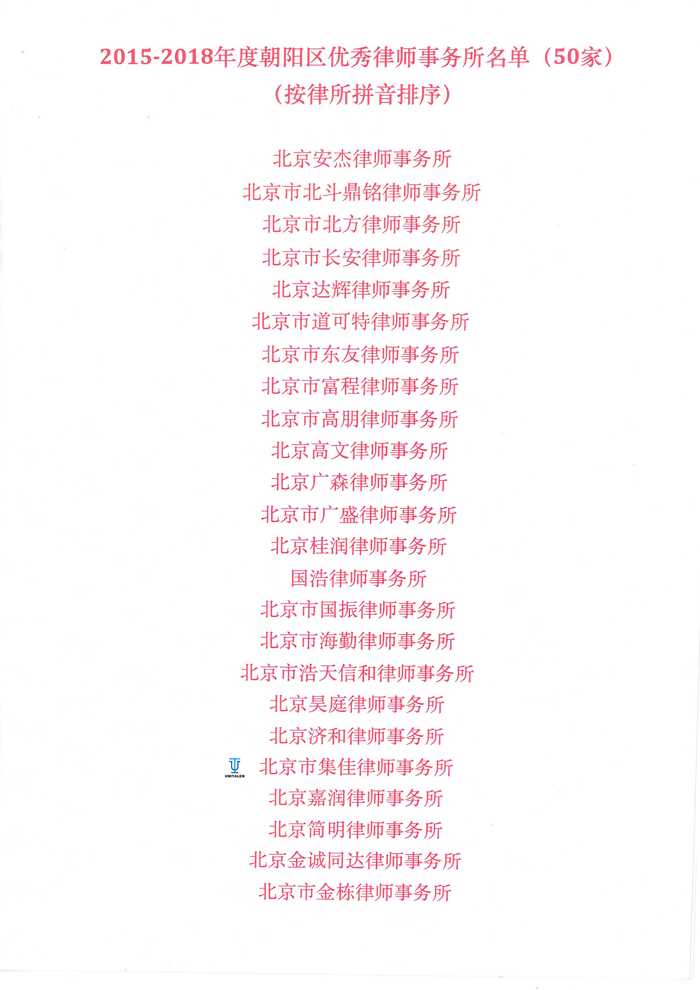 日前,朝陽區(qū)律師協(xié)會公布了2015-2018年度朝陽區(qū)優(yōu)秀律師事務(wù)所和優(yōu)秀律師的名單,集佳律所和集佳律師均位列其中。