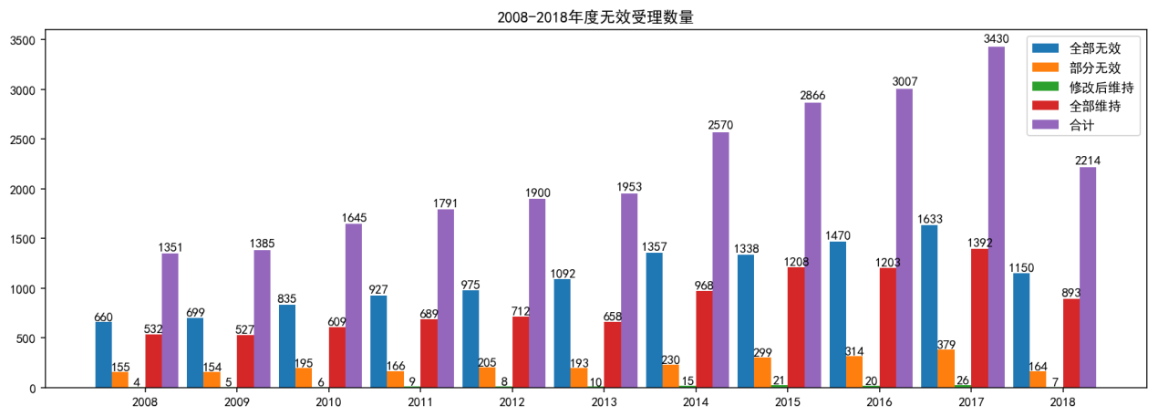 【2】需要說(shuō)明的是,復(fù)審委網(wǎng)站公開的數(shù)據(jù)本身存在一些問(wèn)題(例如個(gè)別決定存在信息缺失錯(cuò)誤等,尤其是早期發(fā)布的無(wú)效決定信息錯(cuò)誤較多),因此,筆者在統(tǒng)計(jì)過(guò)程中剔除了一些錯(cuò)誤或無(wú)法使用的數(shù)據(jù),并重點(diǎn)統(tǒng)計(jì)了2008年后近十年的數(shù)據(jù)。考慮到數(shù)據(jù)的剔除以及編寫的算法可能存在的不足,下面的統(tǒng)計(jì)結(jié)果會(huì)存在一定誤差。另外,考慮到無(wú)效決定都是已經(jīng)完結(jié)的案件,下面的全部統(tǒng)計(jì)分析都沒(méi)有包括尚處于無(wú)效程序中的案件。