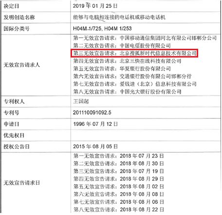 涉案專利名稱為“能夠與電腦相連接的電話機(jī)或移動(dòng)電話機(jī)”,基于該專利,專利權(quán)人王國起自封“發(fā)漢字和圖像信息的電話機(jī)/移動(dòng)電話機(jī)的全世界首創(chuàng)人”。2018年,王國起同時(shí)與中國移動(dòng)、聯(lián)通、電信、搜狐、蘋果、華為、小米、錘子、農(nóng)行、交行等等30余家企業(yè)發(fā)生專利侵權(quán)行政糾紛,涉案金額共計(jì)數(shù)十億元之多。