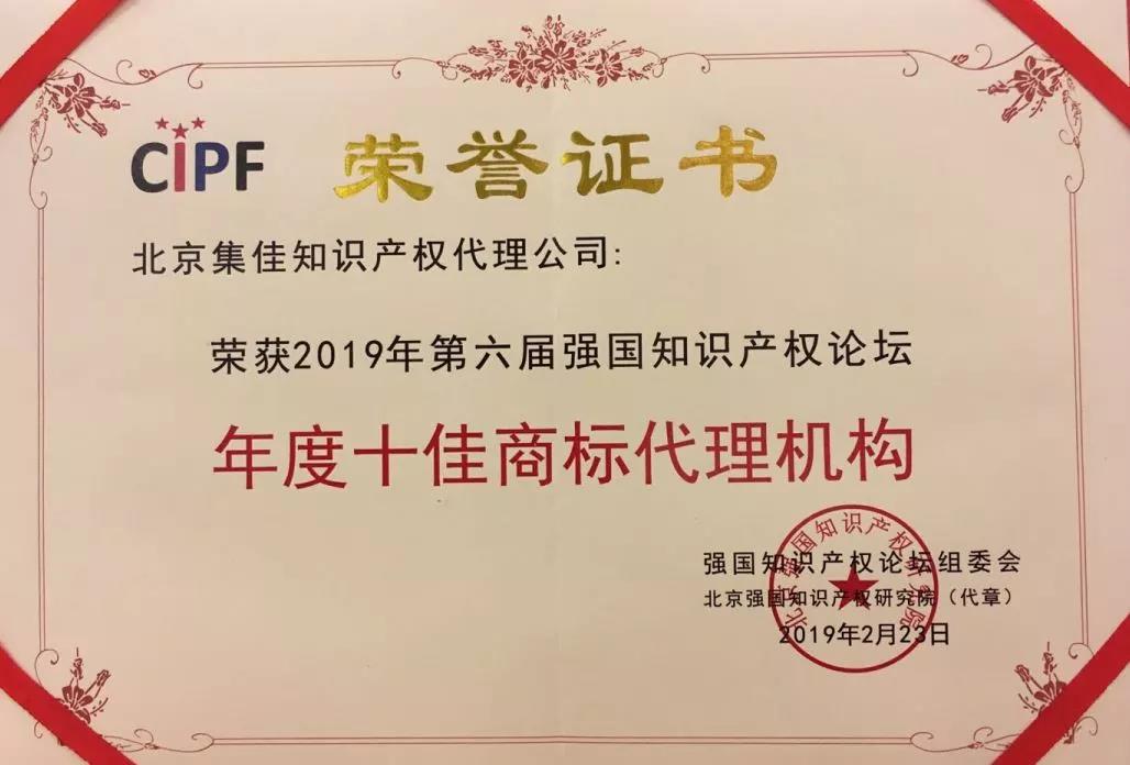 2月23日,由強(qiáng)國知識產(chǎn)權(quán)論壇組委會和北京強(qiáng)國知識產(chǎn)權(quán)研究院主辦的“2019強(qiáng)國知識產(chǎn)權(quán)論壇新春分享會暨服務(wù)業(yè)頒獎典禮”在北京大學(xué)博雅國際酒店舉行。集佳在本年度強(qiáng)國知識產(chǎn)權(quán)論壇服務(wù)業(yè)“十佳”評比中獲得“年度十佳商標(biāo)代理機(jī)構(gòu)”榮譽(yù)稱號,集佳合伙人趙雷律師參加會議并代表集佳領(lǐng)取榮譽(yù)證書。