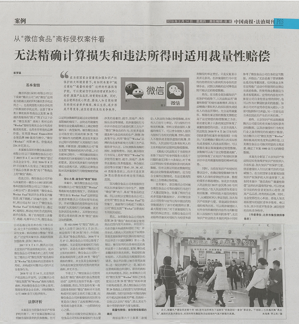 集佳文章《從“微信食品”商標(biāo)侵權(quán)案件看無法精確計算損失和違法所得時使用裁量性賠償》在《中國商報》發(fā)表
