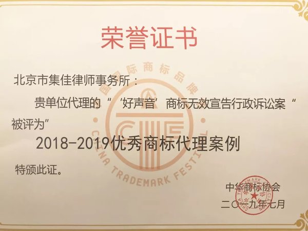 7月6日,第十一屆中國國際商標品牌節(jié)在銀川正式拉開帷幕,各項活動如火如荼地進行著。在商標典型案例評析論壇上,集佳再獲嘉獎,由集佳代理的“好聲音”商標無效宣告行政案被評為“2018-2019優(yōu)秀商標代理案例”。
