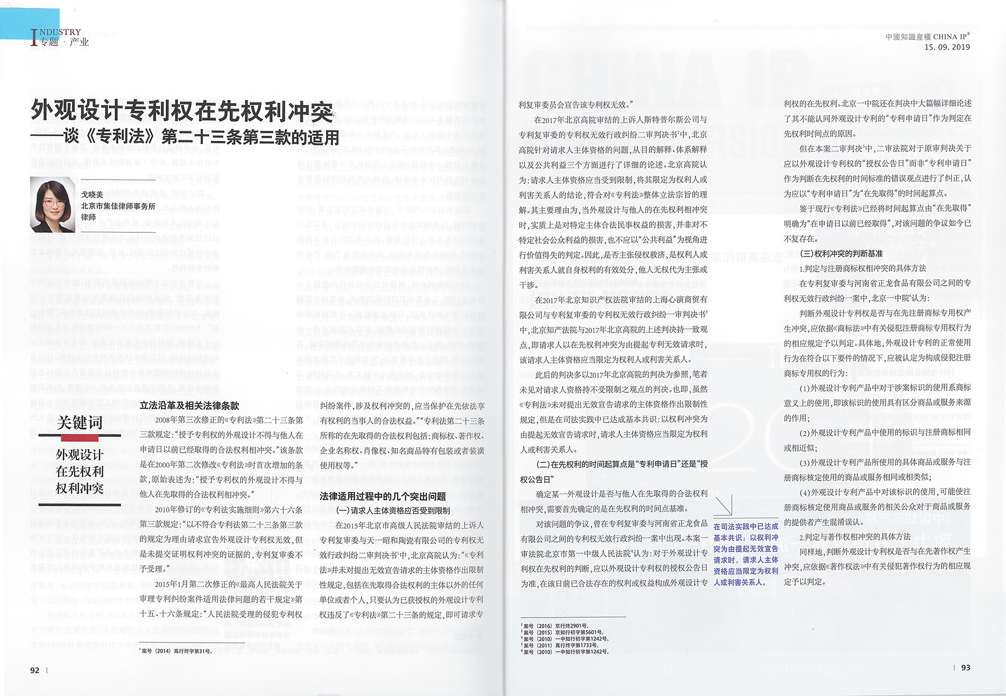 集佳文章《外觀設(shè)計專利權(quán)在先權(quán)利沖突——談<專利法>第二十三條第三款的適用》在《中國知識產(chǎn)權(quán)》 發(fā)表